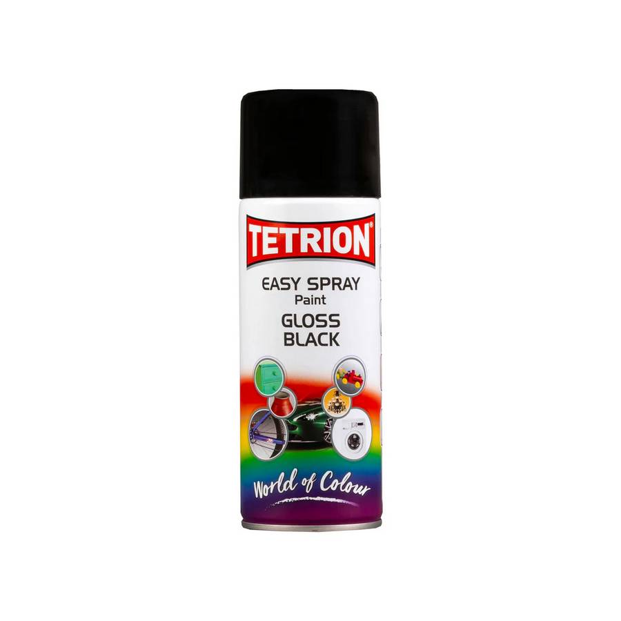 Tetrion Easy Spray Gloss Black (product code: EPB406) is a 400ml, acrylic-based, all-purpose spray paint designed for a smooth, high-gloss finish.